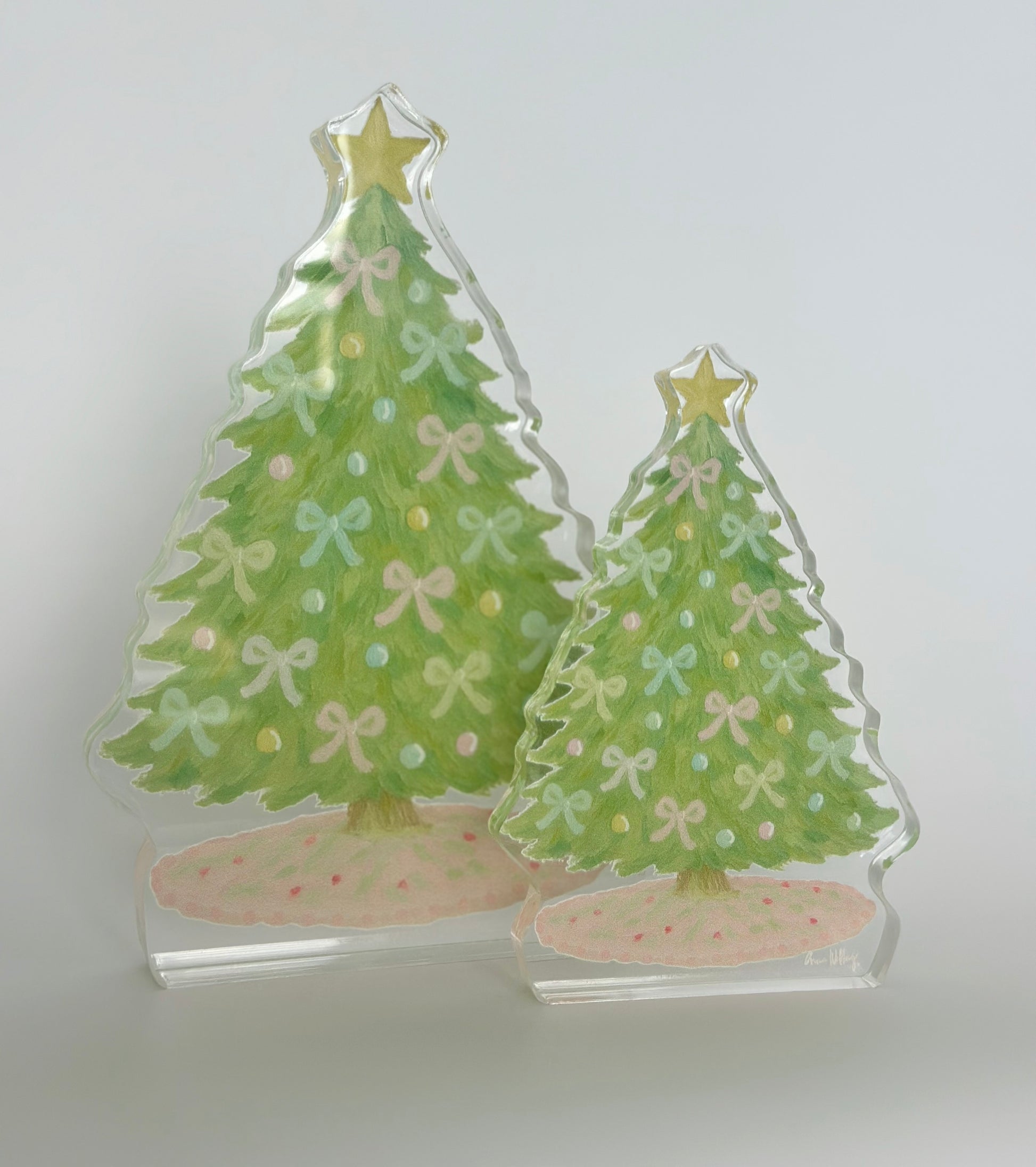 Add a touch of Anna Walding Art whimsy to your holiday decor with these hand-painted pastel acrylic Christmas trees. Each piece features a softly brushed green tree adorned with delicate pastel bows, colorful ornaments, and a gold star on top - all captured in clear acrylic for a timeless, collectible look.